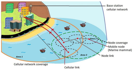 Area 1 (the orange circle): This area corresponds to wireless link activities using cellular technology, in which there is a coverage of approximately 1 km radially. Within this area, information can be sent and received wirelessly using the 850 and 1900 MHz transmission bands for the GPRS and UMTS, respectively. UWSN’s computational architecture is designed to combine or switch between two generations of cellular technology to achieve the best quality for wireless links.
