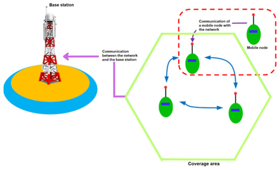 Figure 2 shows the factors that make up the proposed architecture. Related to Figure 1, we obtain the following: base station refers to the distribution antenna (Area 1); mobile node refers to any object that has a sensor node implemented (Area 2); and coverage area represents the communication range between nodes (Area 3).