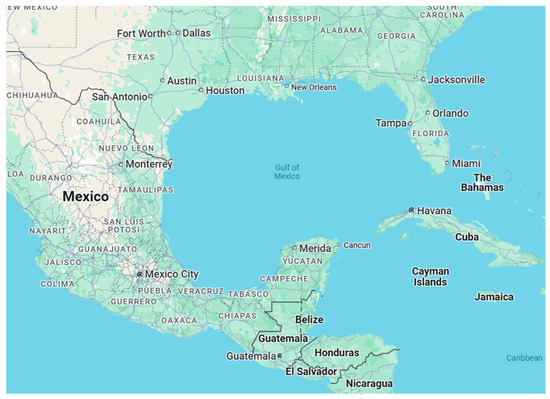 - Google Maps. Available online: https://www.google.com/maps/@21.8757944,-94.8289021,6z?entry=ttu (accessed on 8 January 2025).