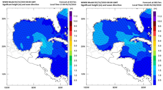 The GoM is characterized by low-amplitude waves of less than 0.5 m high [21] near continental masses and less than 1.5 m high near the outlets to the Caribbean Sea and Atlantic Ocean. In Figure 4, two maps of wave height in the GoM are shown, and the color scale corresponds to the maximum expected wave height, indicating that the waves in the Caribbean Sea are generally less than 2 m high. Therefore, the water parcels can be classified as calm ocean masses, except during certain disruptive events, such as cyclones and storms, among other phenomena [21].