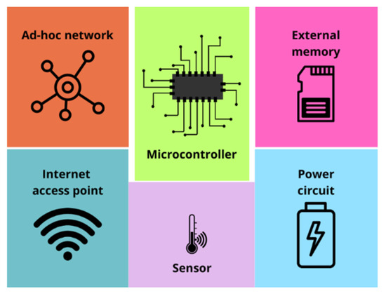With these requirements, it is possible to make a breakdown of the requirements that the embedded system hardware must meet, and some of these are as follows: low-consumption electronic components, high sensitivity in wireless communication systems, and the incorporation of a removable memory. Figure 7 shows a diagram illustrating the parts into which the embedded architecture for the WSN of this work is segmented, in which it can be seen that in the center, there is a microcontroller as the central processing unit (CPU) of the system.