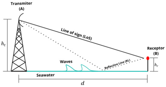 In Figure 8, a scheme for the channel model approach is shown, in which is the height of the transmission antenna, and is the height of the reception antenna; additionally, waves, line of sight (LoS), the reflected line (RL) are shown in relation to the seawater surface, and the red dot represents the sensor node.