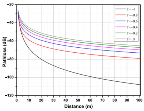 where is the path loss, is the gain of the transmission antenna, is the gain of the receiving antenna, λ is the wavelength, d is the distance between the transmission antenna and the receiving antenna, Γ is the reflection coefficient, is the height of the transmission antenna, and is the height of the receiving antenna. The Γ reflection coefficient relates the power of the reflected signal to the power of the original signal, and the value of this coefficient is −1 for terrestrial transmission [24], which means that all incident power at the surface is reflected in the direction of the receiver. In marine environments, the electrical properties of seawater are dynamic due largely to the heterogeneity of salt concentrations [25]. A signal that hits the surface of seawater may not be fully reflected, so the value of this coefficient may fluctuate between the minimum (0) and the maximum value (−1). Notably, surface effects may significantly influence the attenuation of the signal at the receiver and contribute to other factors (absorption and transmission) that influence signal power. By modifying Equation (1) and considering the coefficient as an additional variable to the model, we obtain the following equation: