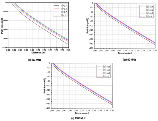 Path loss in seawater at (a) 433 MHz, (b) 850 MHz, and (c) 1900 MHz.