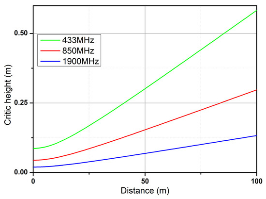 Irregularities on the water surface can cause a signal to be reflected in a diffuse manner depending on the height of these irregularities in relation to the transmission distance and frequency. Figure 14 shows the height at which the waves produce this phenomenon for the three frequencies, whereas Figure 15 shows a close-up to observe in detail the critical height at the 433 MHz frequency.