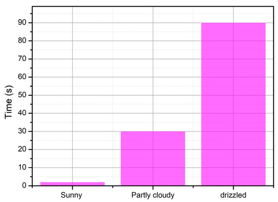 Figure 16 shows in blue the autonomy of each activity performed by the node, considering that the average autonomy of the node is 30 h, a period during which the batteries of the system do not need to be recharged. Figure 17 shows in violet the graphs, in three different scenarios, the time it takes for the GPS sensor to capture information about a valid geographic position. Figure 18 shows in orange the graphs, in three different scenarios, the position deviation that the GPS system may present with respect to the actual geographic position.