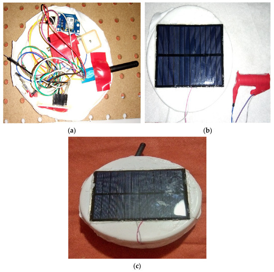 Photographs of the prototype. (a) Circuits that make up the sensor node; (b) outer cover of the sensor container; (c) sealed encapsulation with built-in circuit.