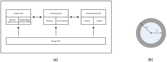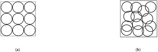 - Barrier coverage: The objective is to obtain an arrangement of sensors with the task of maximizing the probability of detecting the penetration of a specific target through the barrier. Here, sensors are usually deployed not to detect/track events in an area of interest, but to detect intruders attempting to enter that area. As shown in Figure 2a, the protective barrier formed by the sensors ensures that any movement through it is detected. This type of coverage is suitable for motion or intrusion detection applications.