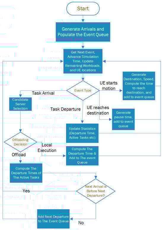 Initially, it is assumed that the ES starts with an empty queue, ensuring no queueing delays for the first arriving tasks. Consequently, initializing for each ES is a reasonable starting point. After the departure of each task from an ES, its q value is updated according to (8). In case of a new task generation, the controller uses the current q value to estimate the expected service time of the task at each ES.