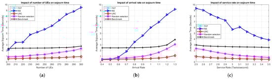 Figure 5a demonstrates the influence of the number of UE on the average sojourn time. In particular, LRC and FAT maintain very similar performance levels, even as the number of users increases, which inherently raises the load on the servers. Both LRC and FAT initially achieve a sojourn time of approximately 0.3 s when the number of users is 200. However, LRC exhibits a slight performance edge as the user count reaches 300, underscoring its superiority under high-load conditions compared to all other methods. On the other hand, NS performs much worse than even RS, which starts at around 0.7 s with 200 users and gradually increases to approximately 3 s as the user count reaches 300. NS, once again, emerges as the least-effective approach, with a notable performance disparity relative to the others. It begins at approximately 5.3 s and progressively rises as the number of users grows, reaching around 11.7 s at 300 users. This underscores the inefficiency of NS in handling increased user loads, primarily due to highly unbalanced server loads, which leads to higher computational delays experienced by users.