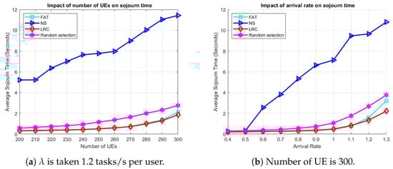 The effect of (a) the number of UE and (b) the arrival rate on sojourn time, respectively, in a scenario with user mobility.