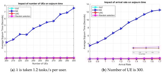Figure 6a demonstrates the influence of the number of UE on the average sojourn time with an arrival rate of 1.2 tasks/s per user. Among all the methods, NS exhibits the poorest performance, primarily due to the asymmetric distribution of BSs, which results in certain BSs becoming overloaded. For instance, as illustrated in Figure 3a, BSs such as BS 15, BS 18, and BS 24 lack neighboring BSs, compelling all the UE in those areas to offload tasks to these BSs and causing the associated ESs to become overloaded. Figure 6b illustrates the effect of arrival rate on the average sojourn time when the number of users is 300. Consistent with previous findings, NS continues to underperform for the reasons previously stated. The performance of RS also begins to deteriorate slightly as the arrival rate increases. LRC and FAT remain effective under higher-load conditions. RS performing not so far off from the LRC and FAT duo can be attributed to it implicitly balancing the load by randomly assigning tasks to different ESs.