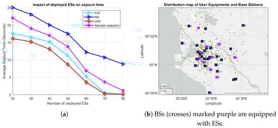 (a) The effect of the number of ESs on the average sojourn time, and (b) the distribution of ESs, BSs, and the UEs (green dots).