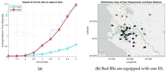 (a) The effect of the arrival rate on the average sojourn time, and (b) the distribution of ESs, BSs (crosses), and the UEs (green dots).