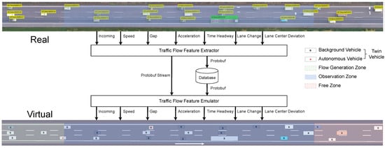 DTTF-Sim divides the road into three functional zones: the flow generation zone, the observation zone, and the free zone, as shown in Figure 1. The emulator generates traffic background vehicles heading towards the observation zone based on vehicle incoming features in the flow generation flow generation zone. When vehicles enter the observation zone, background vehicles, under the guidance of the emulator, engage in dynamic interactions such as following behavior, lane changing, and collision avoidance control with surrounding vehicles to ensure the safety and stability of the traffic flow. To optimize computational resources, background vehicles are destroyed by the emulator when they enter the free zone. The lifecycle of a background vehicle begins in the flow generation zone, passes through the observation zone, and ends in the free zone.