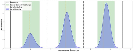 Figure 2. The kernel density of vehicle lateral position. The lateral position data of vehicles were obtained from the HighD dataset, specifically from the trajectories in locationId 3, which involved no lane-changing events. A total of 1559 trajectories were analyzed. The green zone in the figure represents the concentrated lateral driving region of vehicles, indicating their primary activity range within the lane. This region can be effectively used to define the start and end of lane-changing behaviors.