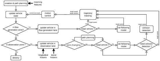 Current simulation tools can be broadly classified into four categories: flow-based simulators, scenario-based simulators, vehicle-based simulators, and data-driven simulators. Flow-based simulators, such as SUMO [2], PTV Vissim [3], Aimsun [4], and Paramics [5], can effectively simulate vehicle movements within road networks to evaluate the effectiveness of various traffic management and planning strategies. However, their simplified approach to vehicle simulation limits their ability to accurately represent the attributes of autonomous vehicles, particularly their kinematic features [2]. Scenario-based simulators, such as Virtual Test Drive (VTD) [6] and CARLA [7], use standard scenario files (e.g., OpenSCENARIO) to depict interactions between vehicles and provide kinematic attributes as well as basic dynamic system features, such as engine response and braking performance. Nevertheless, these scenario files require predefined relative positions, velocity changes, and interaction rules between vehicles, driven by behavior trees [8]. This dependency restricts the simulators’ ability to comprehensively evaluate complex game-theoretic behaviors among vehicles in dynamic environments. Vehicle-based simulators, such as Matlab Simulink (version R2023a) and CarSim (version 2023.1), focus on accurately modeling vehicle dynamics. These tools analyze and assess the impacts of individual vehicle components, such as tires, suspension systems, and engines, on overall vehicle performance. Data-driven simulators rely on deep neural network models and high-quality road datasets, such as SimNet [9] and TrafficGen [10]. These simulators leverage neural network models to extract vehicle trajectory features from the datasets, thereby enabling the regeneration of original traffic scenarios. However, current data-driven simulators are limited to providing fragmented test scenarios and have not yet achieved the capability to support long-duration continuous testing.