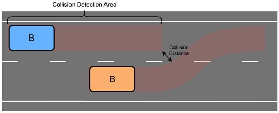 To enhance the timeliness of collision detection, DTTF-Sim employs the collision detection methodology illustrated in Figure 5. The red area delineates the collision detection area for background vehicles. This detection area extends rearward from the vehicle along its trajectory, with its length defined by Equation (3). DTTF-Sim assesses the risk of collision by calculating the minimum distance between two potential colliding vehicles.