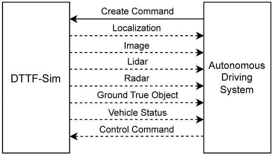 The twin vehicles are composed of an autonomous vehicle and a background vehicle. The construction method of background vehicles is detailed in the preceding section. Autonomous vehicles are controlled by an external autonomous driving system whose control logic is illustrated in Figure 6. DTTF-Sim provides users with comprehensive protocols for configuring autonomous vehicles and their sensors, allowing users to create them at any time. Once an autonomous vehicle is created, vehicle information and sensor data are transmitted to the autonomous driving system via network communication methods. This system generates control commands based on the received data to regulate the operation of vehicles within the simulation environment and facilitates interaction with other background vehicles.