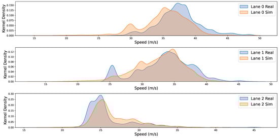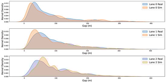 - Lateral Features: capture lane positioning and lane-changing behaviors. Lane-center deviation is defined as the vehicle’s lateral offset relative to the centerline of its current lane, as is shown in Figure 2. The extractor constructs a lateral kernel density map to determine the stable driving region for each lane, denoted . A lane-changing event is detected when a vehicle exits its current lane’s concentrated range and enters the target lane’s range. A complete lane-change trajectory is annotated with the following attributes: start and end times of the lane-change ; original and target lanes ; vehicle speed at the lane-change start ; and gaps to surrounding vehicles. These lateral features provide the foundation for modeling realistic lane-changing decisions and interactions among vehicles in adjacent lanes.