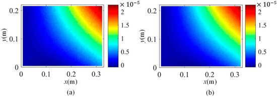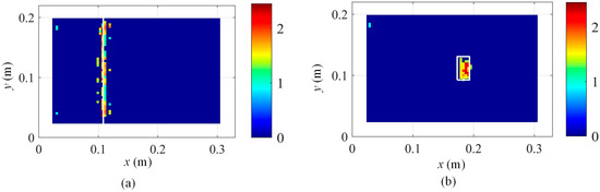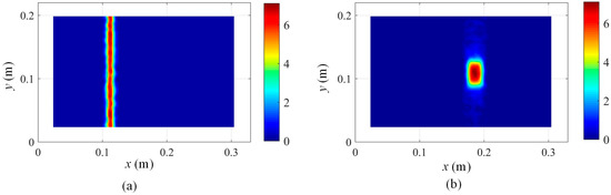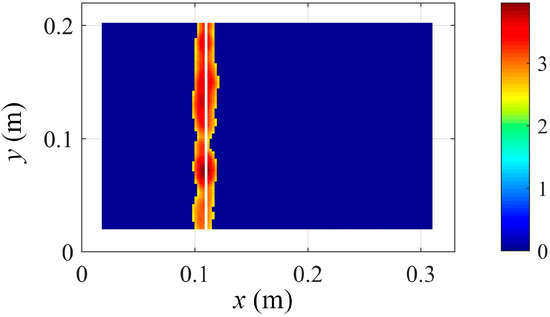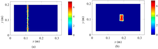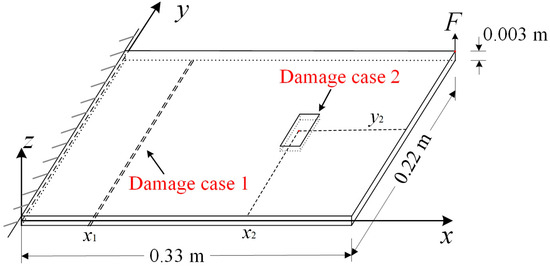 In this section, two damage scenarios are conducted, and their configurations are illustrated in Figure 3. Furthermore, Table 1 describes the plate’s material and geometrical properties. For the first damage scenario, crack damage with a width of 0.002 m is located on the opposite surface of the data-acquisition surface and is 0.11 m from the axis. For the second damage scenario, the damage zone is centered at (0.185 m,0.11 m), with an area of 0.02 m 0.04 m. In both damage scenarios, the damage depth is 0.001 m, and the damage is hidden damage, which means that it cannot be observed from the data-acquisition surface.