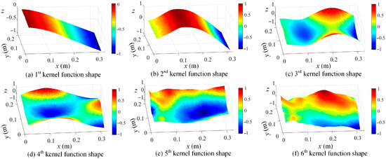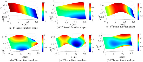 Based on Equation (5), the kernel functions are readily constructed by using the SVD method, and the first six kernel functions are demonstrated in Figure 19. Based on the first 20 kernel functions, the shape descriptors are estimated based on Equation (6). With the shape descriptors, the resonant frequencies of interest are obtained using the singular value spectrum plot, as given in Figure 20.