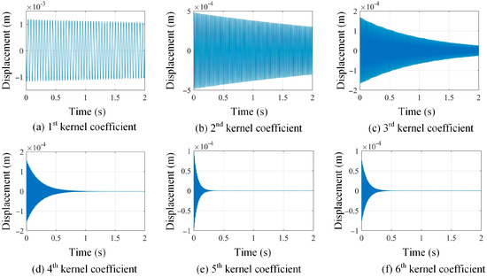 In Figure 4, kernel functions are different for different measurement datasets, and their geometrical domain is naturally the same as full-field displacement maps. Moreover, the ascending order of kernel functions indicates their descending contributions to the full-field measurements in the regime of the SVD approach. Based on the constructed kernel functions, the full-field dynamic displacement maps of damage scenario 1 are decomposed, and the shape coefficients corresponding to the first six kernels are taken as an example and presented in Figure 5. In this case, the large amount of full-field vibration data is low-rank-represented by using the kernel functions. Furthermore, the efficiency of operational modal analysis will be significantly enhanced by using kernel functions and their coefficients.