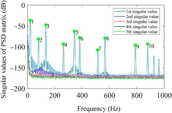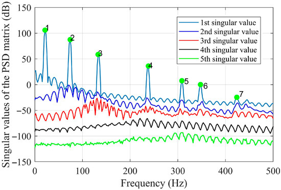 in which is a superscript indicating the Hermitian transpose. By processing via singular value decomposition, the resonant frequencies are evaluated as the peaks in a singular value spectrum plot, and mode shapes in the SD domain are estimated as singular vectors: