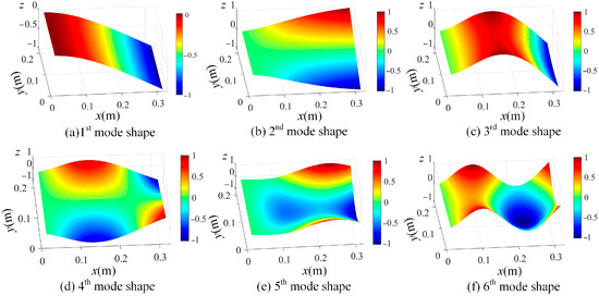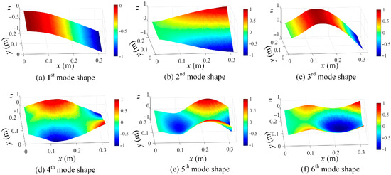 With those determined resonant frequencies in Figure 20, the mode shapes in the shape descriptor domain can be computed based on Equation (10). Consequently, the mode shapes in the spatial domain are calculated from Equation (11), and the mode shapes corresponding to the first six modes are shown in Figure 21 in increasing order. In comparison with Figure 10, the identified mode shapes from the experiment are in good agreement with those of the numerical study.