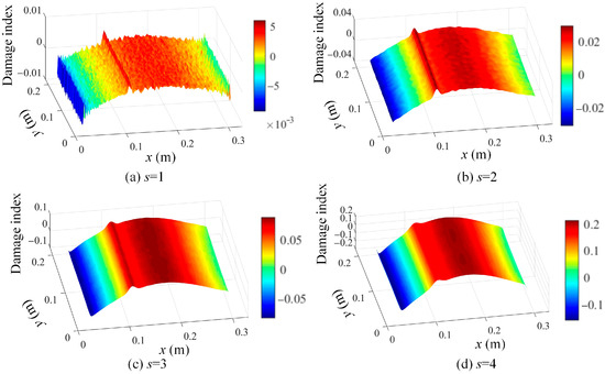 In Equation (16), represents the damage index containing the damage features of the r-th mode, and the selection of scale parameter is critical for extracting actuate damage features. A smaller s would lead to many outliers due to the measurement noise. By increasing , fine-scale features would gradually disappear, which include both the noise effects and damage-induced local features. Therefore, with a larger , damage-induced local shape characteristics will be smoothed as well. Based on simulation studies, the proper value of the scale parameter is determined and used in all the cases reported in the paper to demonstrate the validity and the accuracy of the proposed multi-damage identification method. Moreover, if the determined value is not proper for experimental data, the right scale parameter value can be readily evaluated by a trial-and-error method.