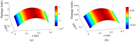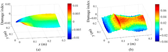 In order to extract the damage features from Figure 11b, the proposed method in Equation (17) is adopted, and the damage localization results are presented in Figure 13a. Moreover, the damage location detection results of damage scenario 2 are also shown in Figure 13b. Figure 13 demonstrates that the damage location information can be effectively extracted based on the proposed method in Equation (17).