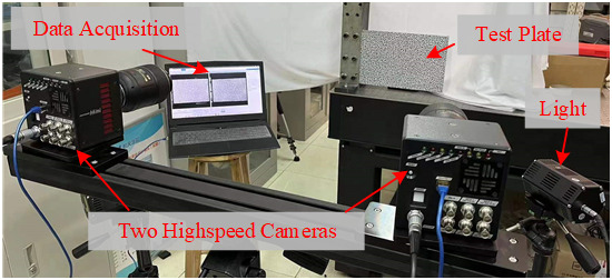 To experimentally verify the efficiency and effectiveness of the low-rank and sparse decomposition approach in processing the full-field vibration data for modal analysis and damage position identification, an experimental case study of a cracked plate was conducted. The experimental set-up with the high-speed cameras is presented in Figure 17; the two high-speed cameras are Photron Mini AX200. The dimensions of the aluminum plate are 330 mm × 220 mm × 3 mm, and a crack damage of 220 mm × 2 mm × 2 mm is located on the unobservable surface, which is illustrated in Figure 18.