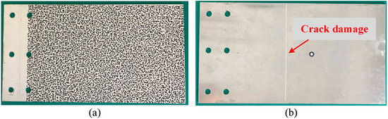 (a) Front surface with speckle patterns and (b) back surface with damage information of the tested plate.