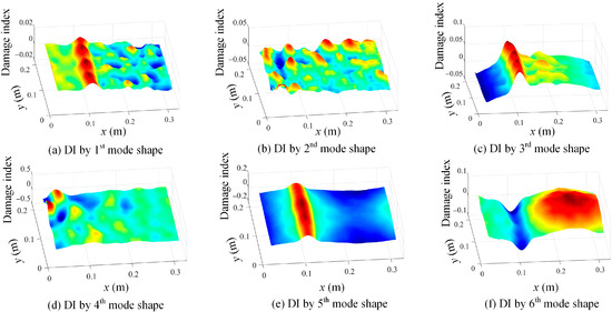 Moreover, without the reference mode shapes of the healthy state, the damage positions can be revealed by exploring the local shape distortions of . But damage detection based on a single mode is not robust, and damage features should be extracted and fused for a robust damage identification. To tackle this problem, pseudo-mode shapes of the healthy state are constructed based on the Chebyshev moments. It should be noted that the pseudo-mode shapes can also be evaluated via Zernike moments or polynomial bases. When the Chebyshev moments, Zernike moments, and polynomial bases are determined according to the measurement coordinates, their computation efficiency is all very high. Here, Chebyshev moments are adopted, as they are rectangular orthogonal keener moments, which can represent rectangular displacement maps by fewer moments. Consequently, the local damage features are evaluated by comparing the evaluated mode shapes of the proposed adaptive kernel function-based method with .
