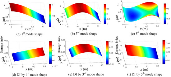 By using the shape descriptor-based mode shapes in Figure 21, the damage location identification results using Equation (16) are given in Figure 22. Figure 22 manifests that the proposed method is effective in revealing the damage features, but the second and fourth modes are insensitive to the damage location. Moreover, the evaluated mode shapes based on Chebyshev kernels are shown in Figure 23a–c, and their corresponding damage localization results based on Equation (16) are presented in Figure 23d–f. It can be concluded that the evaluated mode shapes by Chebyshev kernels do not contain local damage information and thus cannot be adopted for damage identification.