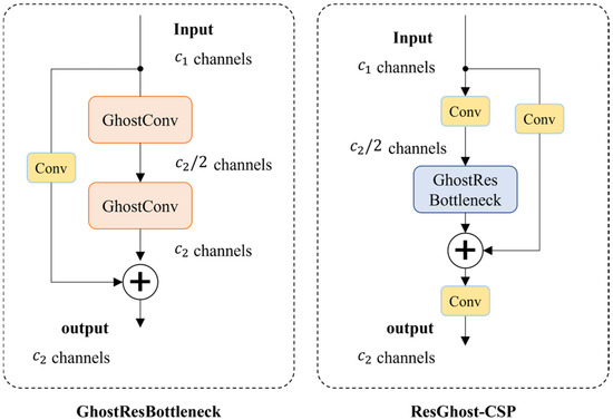 GhostConv achieves approximately 50% of the computational cost of standard convolution (Conv) while maintaining comparable feature learning capability. Based on GhostConv, this study proposes the GhostResBottleneck structure, which integrates GhostConv with residual connections. The specific architecture of GhostResBottleneck is illustrated in Figure 4. Furthermore, to enhance the feature learning capability of CNNs, this study incorporates generalized deep learning optimization strategies [27,28,29] and employs a one-shot aggregation strategy to design an efficient, hardware-friendly cross-stage partial (CSP) module—ResGhostCSP. This module maintains high accuracy while effectively reducing computational complexity and inference time, as depicted in Figure 4.