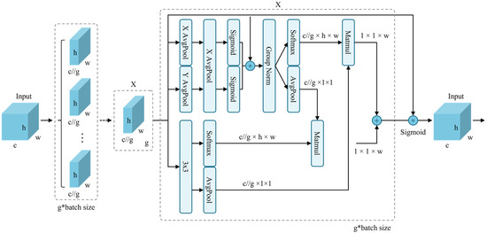 where C represents the number of channels, and H and W denote the spatial dimensions of the input feature map. The EMA mechanism (Figure 5) first partitions X into G groups of sub-features along the channel dimension: