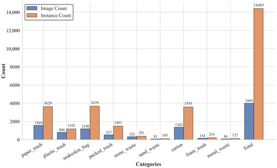 Figure 8. Category distribution of the dataset: the dark blue bars represent the number of images per category, while the dark orange bars indicate the instance count for each garbage category.