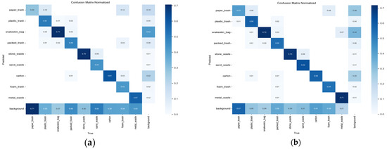 Figure 9. Confusion matrices under the mAP@0.5 metric. (a) YOLOv8s; (b) EcoDetect-YOLOv2.