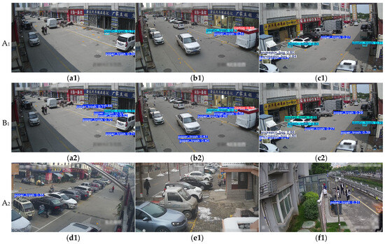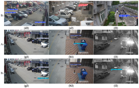 Figure 10. Visual comparison of detection results on the dataset. Row A presents detection outcomes of the baseline YOLOv8 model, while Row B shows results from the proposed EcoDetect-YOLOv2. Bounding box colors indicate different types of detection errors: orange denotes missed detections, purple indicates false positives, and all remaining colors represent correctly identified waste items across different categories. Subpanels (af) compare the two models’ performance on smallobject detection tasks; panels (c,g,h) highlight the baseline model’s elevated false-positive tendency; panel (i) illustrates detection efficacy under nighttime conditions.