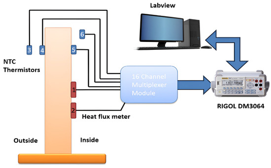 The temperature measurement system developed is superior to existing commercial ones in terms of precision and capabilities, consisting of 16 measurement channels that can be used both for temperature measurement (resistance measurement) and for measuring the output voltage of the heat flux sensor. In this way, it is possible to place several temperature sensors in different parts of the wall (or other areas to be assessed) which can be used to obtain more reliable results. Using this method, better sensitivity and accuracies are achieved because a high-precision, 6.5-digit digital multimeter is used for measurement. Furthermore, all temperature sensors are calibrated, which ensures a precision between sensors better than 1 mK. The measurement method is programmed in the LabVIEW programming language, and the measurement period can be arbitrarily selected, even modified on the front panel of the measuring system. The period is selected considering the actual conditions, without downloading unnecessary data, but with the possibility of recording all transient changes in climatic conditions.