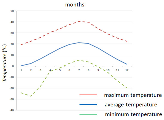 Figure 5 presents a map highlighting the location of Zagreb. Figure 5 illustrates the anticipated trends in air temperature throughout the year based on data recorded in Zagreb and sourced from the State Hydrometeorological Institute (DHMZ) archive [26]. In Figure 6, the months are numbered from 1 (January) to 12 (December). The graph features a continuous line to represent mean values, while dashed lines indicate the minimum and maximum expected values, offering a comprehensive view of seasonal variations.