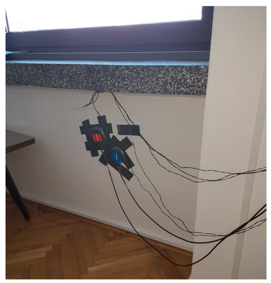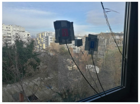To ensure uniform and stable temperatures, the rooms were air-conditioned, either heated or cooled, for 24 h, maintaining a temperature difference of no less than 10 °C between the inside and outside of the window or wall. The specific temperature values varied across tested cases and are detailed in Section 3. Thermographic examination was employed to identify the most suitable area of the wall surface for thermal transmittance measurement. The heat flux meter plate was positioned 0.5 m above the floor, with sensor placement carefully planned. Technicians used color-coded sensors to ensure accurate identification of their positions on the opaque wall. Sensor placement relative to the heat flux plate was precisely determined to facilitate multiple measurements across different areas of the wall. To attach the heat flux sensors to the opaque wall, adhesive tape was used for easy removal after the experiments. To improve contact between the temperature probes and the surface on which they are placed, thereby minimizing unwanted thermal resistance caused by poor contact, commercial high-temperature silicone grease was applied to the selected areas. Each temperature probe was then secured to the silicone within a specialized casing. The casing’s aluminum base, in contact with the wall, ensured optimal thermal conductivity, while the outer plastic layer provided durability and insulation.