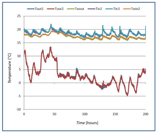 Each temperature value was measured with two sensors from which the mean value was taken. Figure 13 shows the measured temperature values on the outside of the window at 10 cm from the surface (Tout1 and Tout2), the measured temperature values on the glass itself on the outside (Twout), the measured temperature values on the inside of the window at 10 cm from the surface (Tin2 and Tin3), and the measured temperature values on the glass itself on the inside.