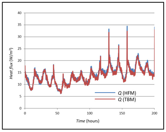 The results obtained were compared with the results obtained using the TBM model using Formula (4). Rsi is estimated using standard values for building materials and is 0.13 m2K/W [3]. In this case, the heat flux Q is obtained from the following formula: