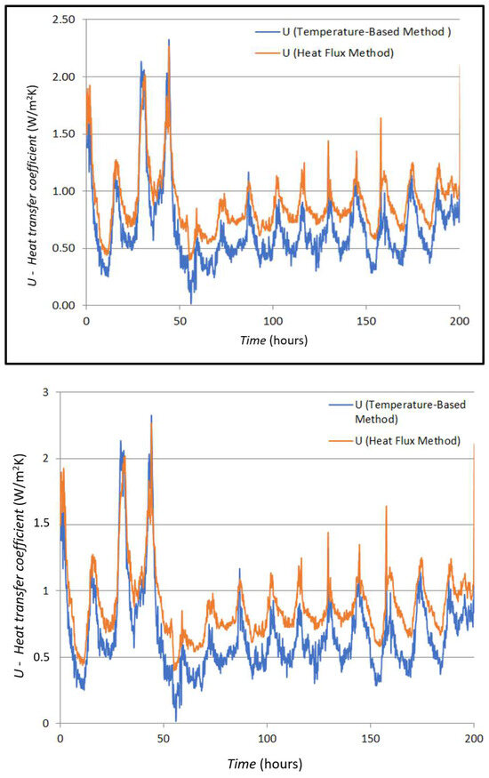 This study improves the clarity of measurement accuracy and methodology. The experimental setup supports the simultaneous application of the temperature-based method (TBM) and the heat flux meter (HFM) method, using a system equipped with 16 channels for temperature and heat flux sensors. This configuration allows for a real-time comparison of the two methods and the collection of a large amount of measurement data. To address the limitations of changing conditions, ISO 9869-1:2014 [1] recommends the use of an average method for determining the U-value. This approach involves analyzing measurements over time and averaging the data over several days. The device’s ability to record thousands of data points every 15 min, for each sensor, ensures a robust data set. During the analysis, outliers (such as events caused by people entering the room, opening windows or doors, or sudden changes in heating) were identified and excluded.