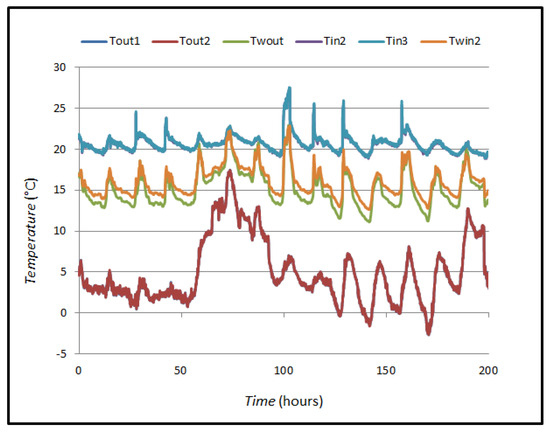 In this experiment, two heat flux sensors are used, and the temperature is measured by NTC thermistors EC95F103 placed near the heat flux sensor on the wall surface and on sensors located away from the wall to determine the temperature in the interior and exterior space. The room is maintained at an approximately constant temperature by means of an air conditioner. The measurement is performed during several cold winter days, from which a period of 200 h (9 days) of periodic temperature changes is analyzed and presented.