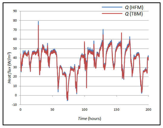 Figure 8 shows the Q value, its measured value with a heat flux sensor using the HFM method and the Q value of the heat flux measured and calculated using the TBM. The mean value of the heat flux using the TBM is 13.89 W/m2, and the mean value of the heat flux using the HFM method is 17.43 W/m2. The values were compared, and their mean difference was calculated as 3.54 W/m2.