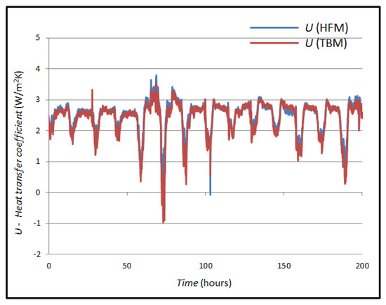 In the first case, measured heat flux values were used to obtain the U-value according to Formula (3) as follows: