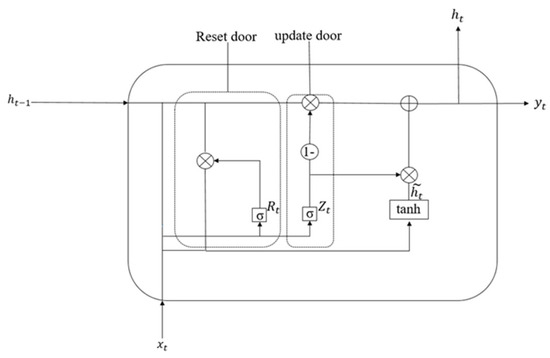 The gated recurrent unit (GRU) represents a streamlined adaptation of long short-term memory (LSTM) architectures, maintaining temporal dependency modeling capabilities while eliminating redundant gating mechanisms. However, unlike the latter, the GRU merges the forgetting gate and the output gate into an update gate, integrates the unit state and output into a hidden state, and realizes the function of transmitting information by hiding information. The system of the GRU is shown in Figure 5.